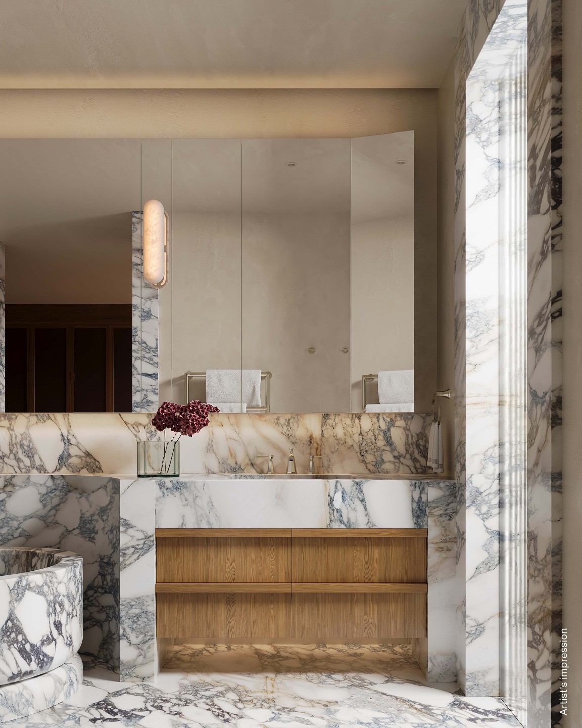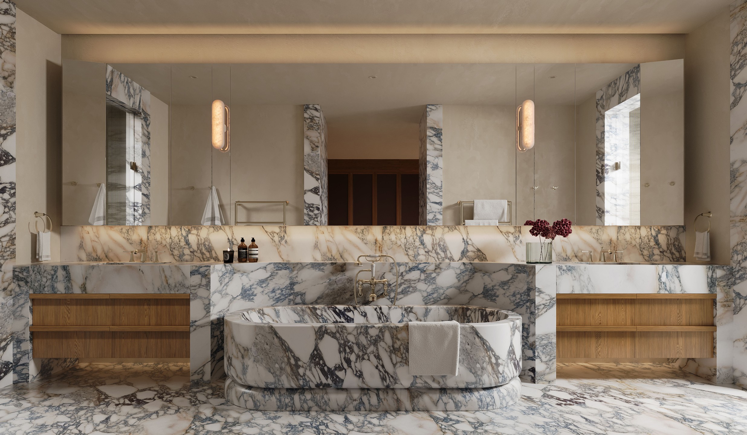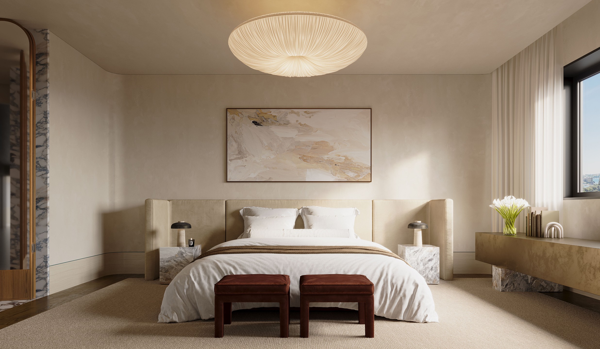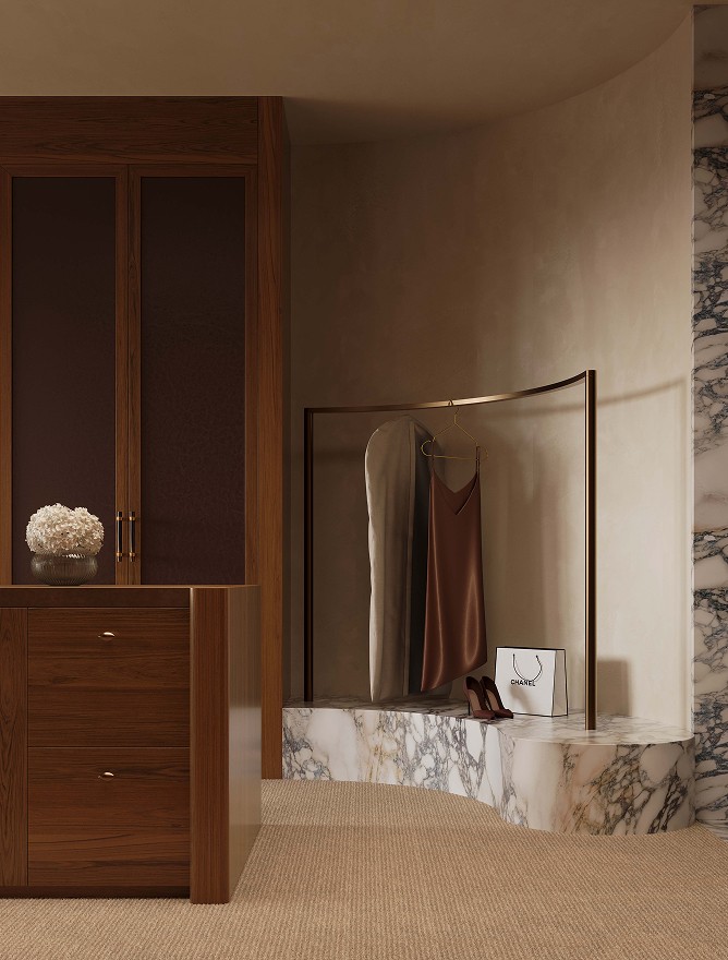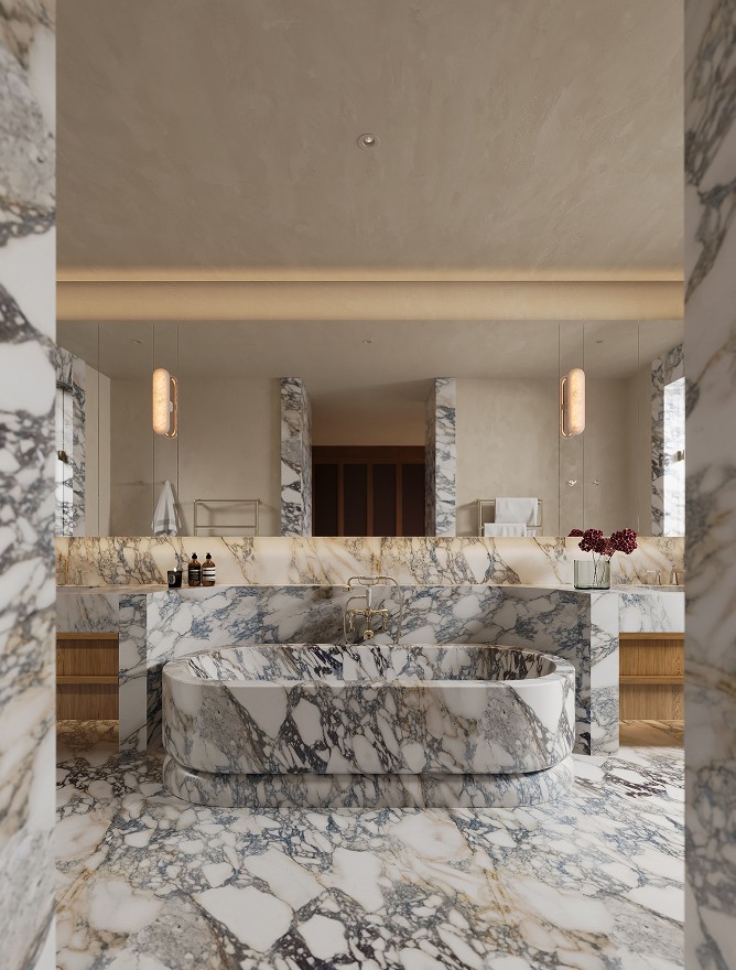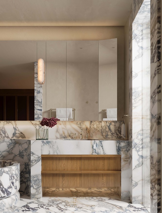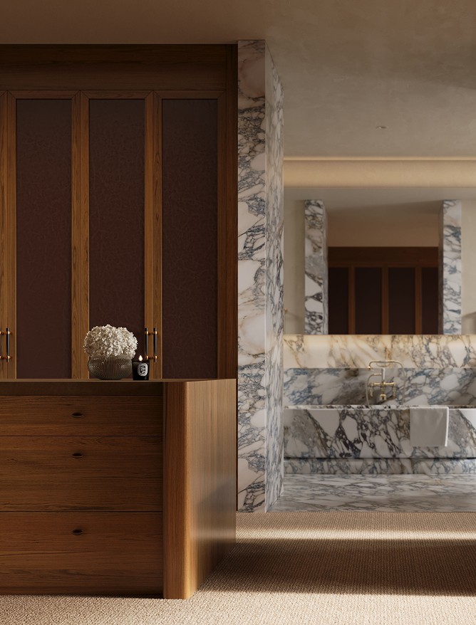 Venetian plaster, north facing glazing, feature pendants and velvet drawer linings. French oak joinery carries through to the grand dressing room. The bathroom holds its own: twin marble basins, porcelain tile, a curved marble bathtub that earns the space it occupies.