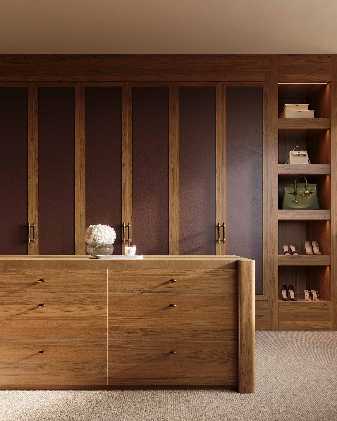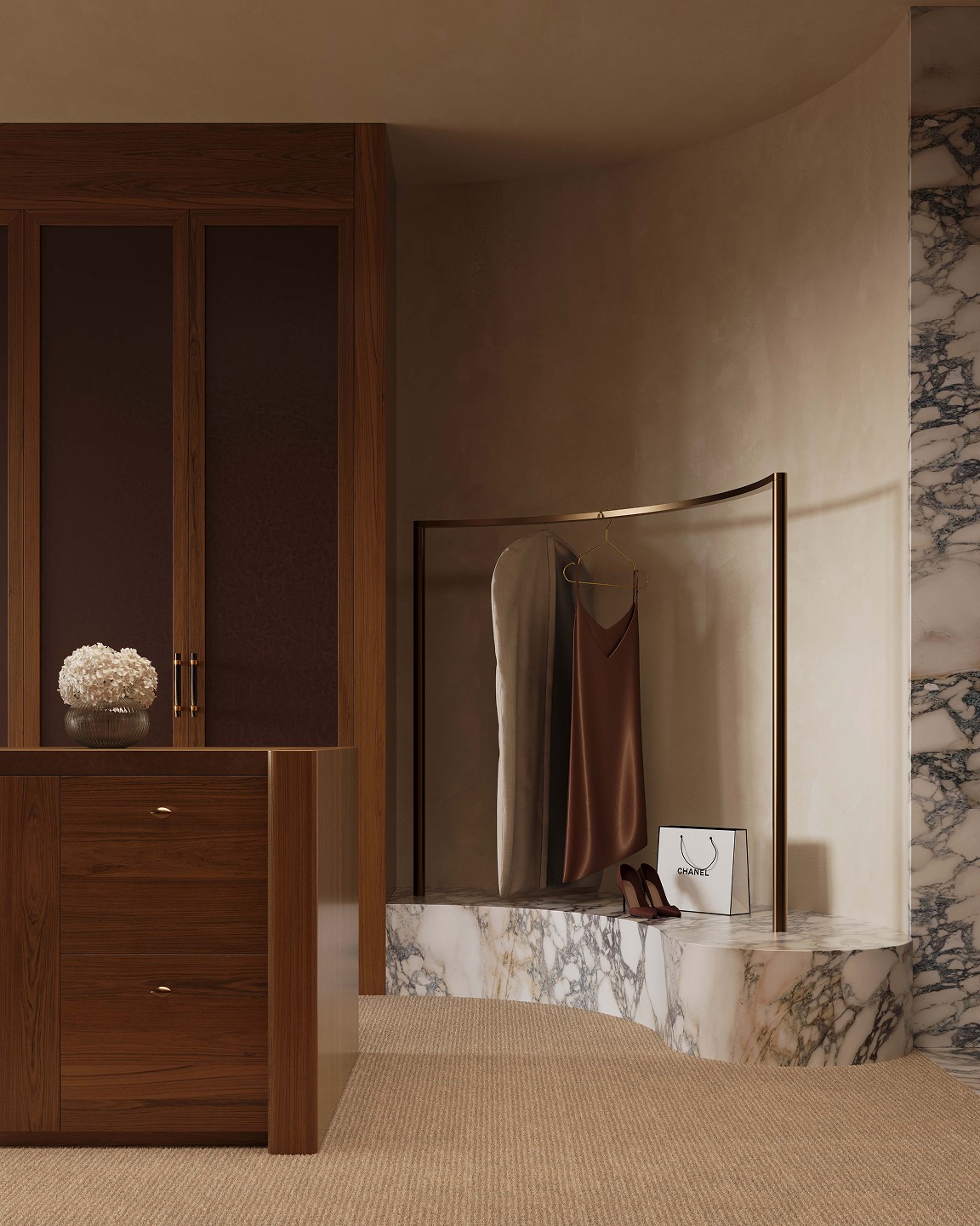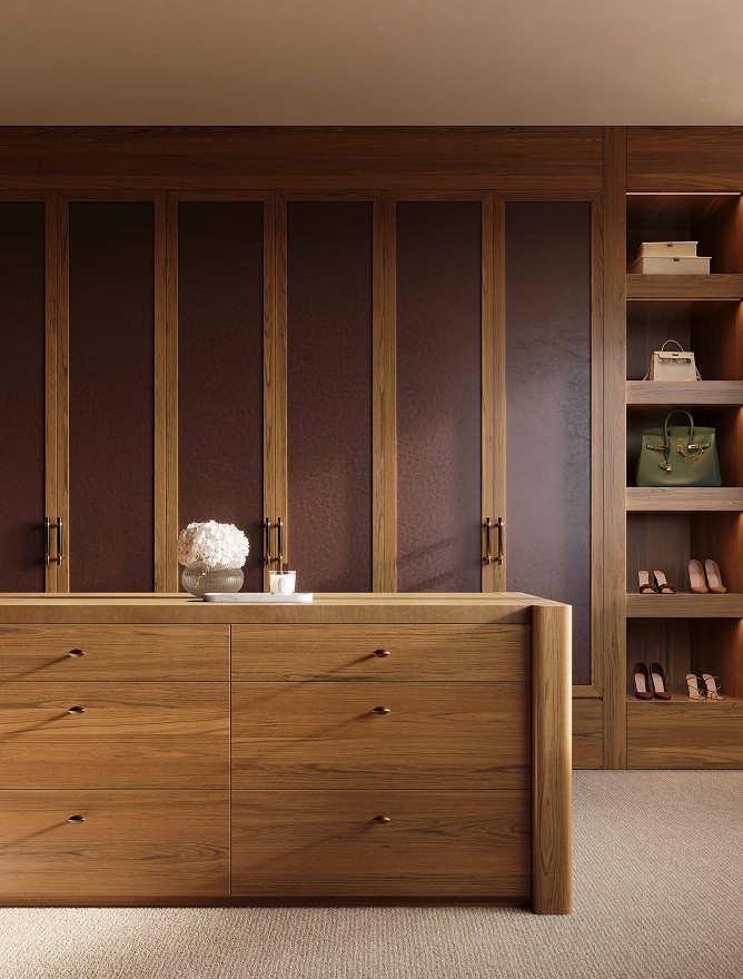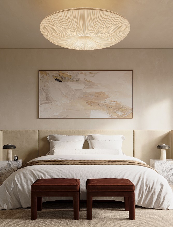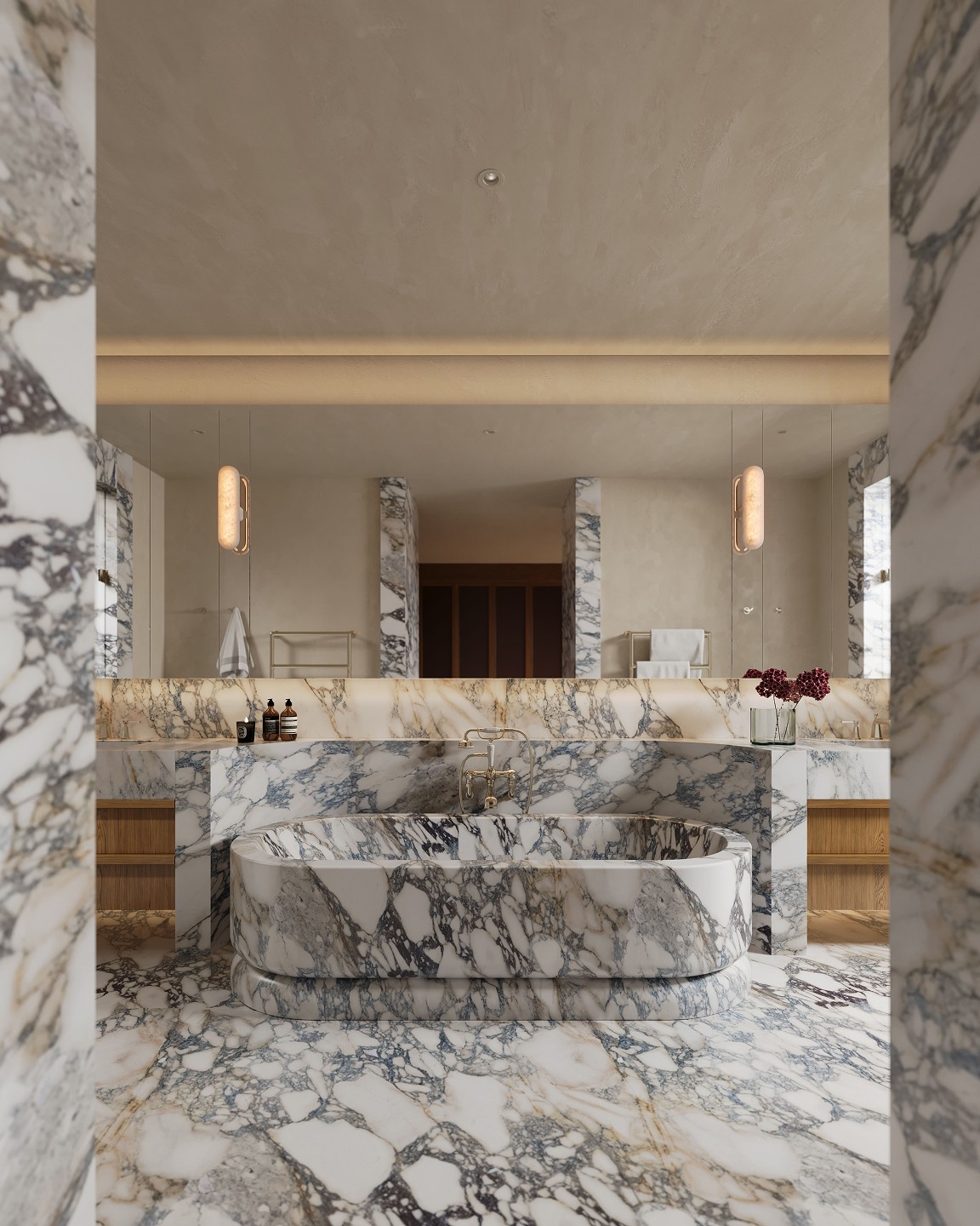 Venetian plaster, north facing glazing, feature pendants and velvet drawer linings. French oak joinery carries through to the grand dressing room. The bathroom holds its own: twin marble basins, porcelain tile, a curved marble bathtub that earns the space it occupies.